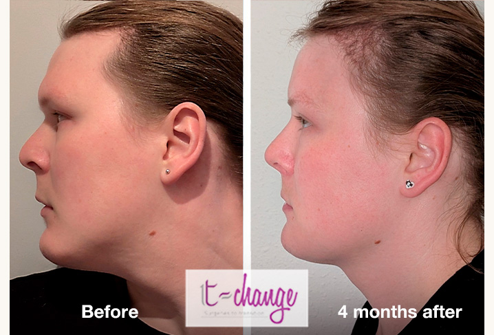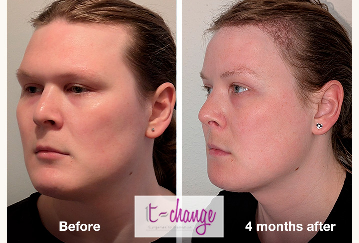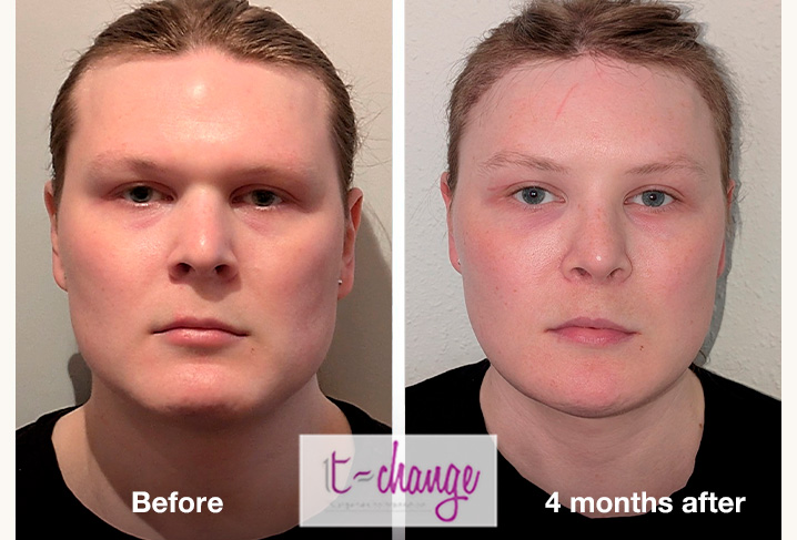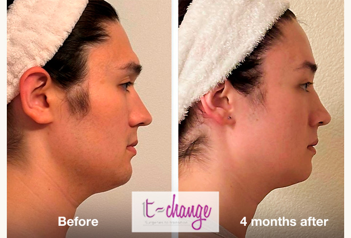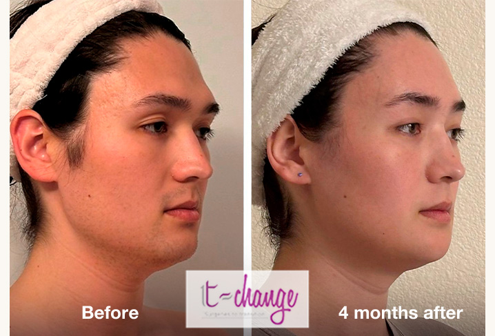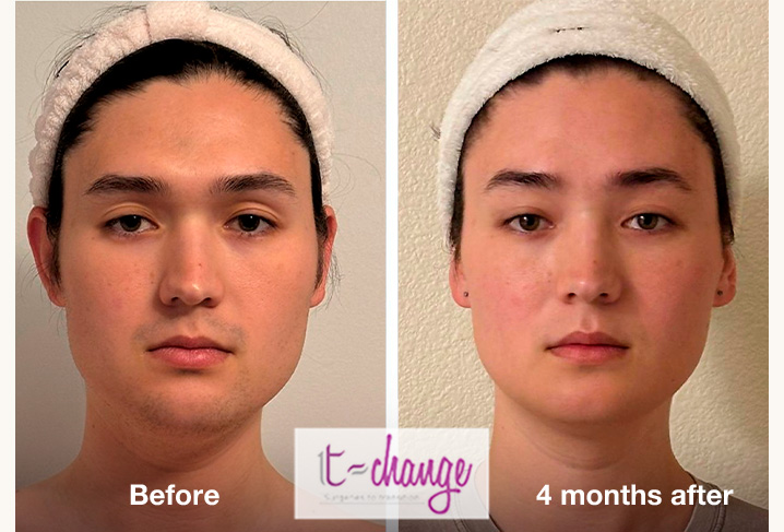 Example 17 - Full FFSβ Left: before surgeries / Right: 4 monthsafter. Photos provided by the patient. β Procedures performed: forehead reconstruction, rhinoplasty, chin and jaw contouring, trachea shave.